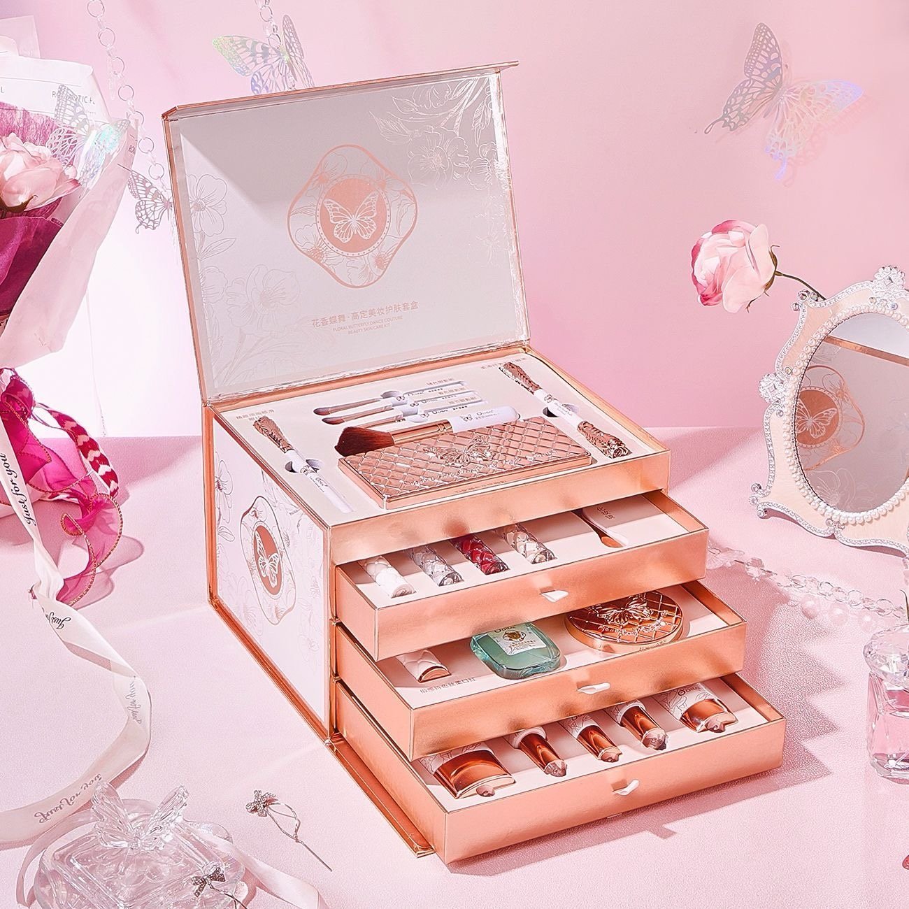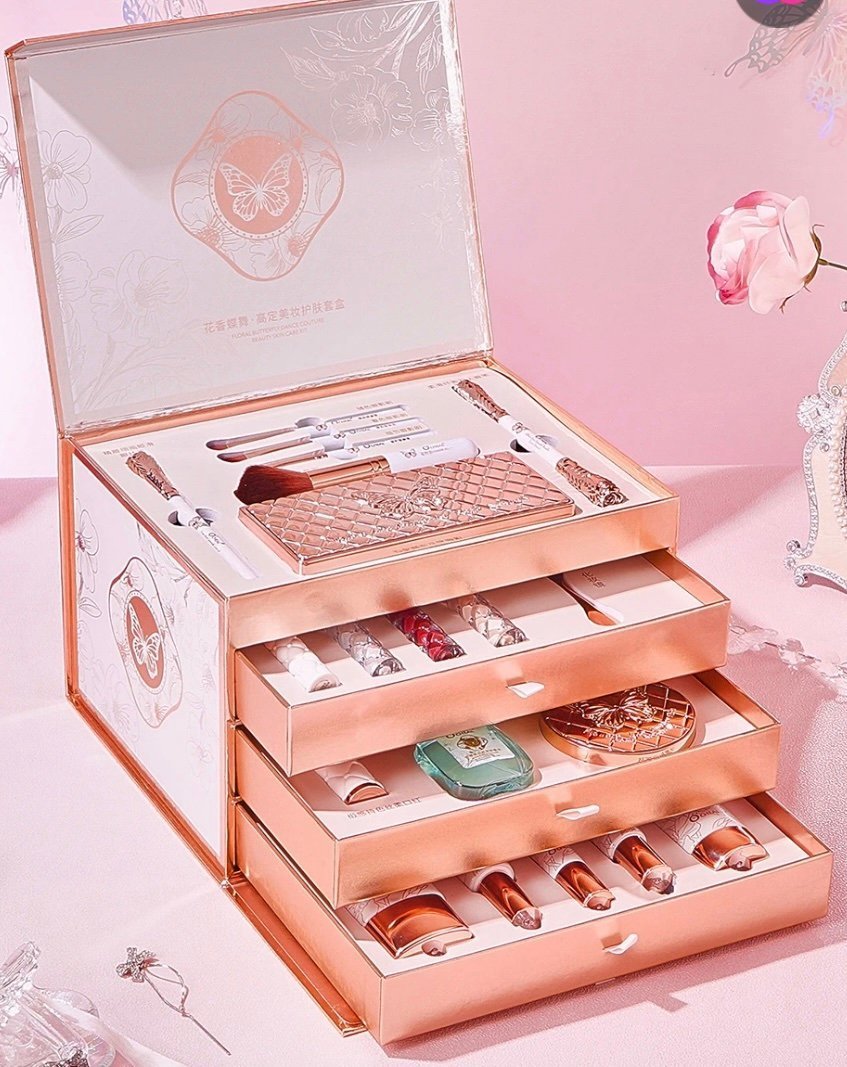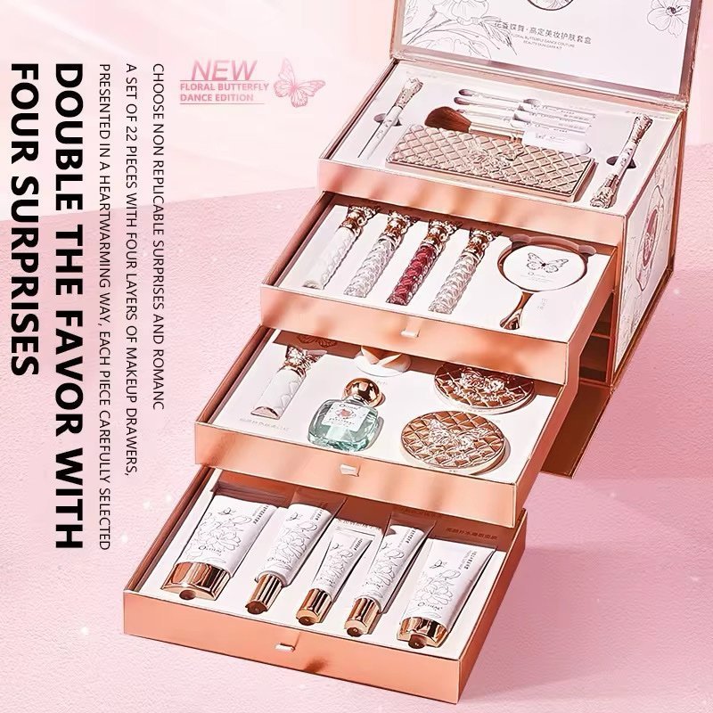 Coffret maquillage 22 pièces O’CHEAL Butterfly Dance avec soins, parfum, pinceaux, palette, rouges à lèvres et accessoires beauté dans une boîte tiroir chic.