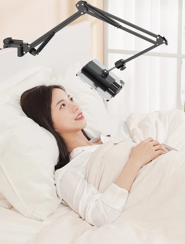 Bras articulé à ressorts : Permet d’ajuster facilement la hauteur, l’angle et l’orientation de l’appareil pour un confort visuel maximal. Idéal pour le télétravail, les appels vidéo, les dessins numériques ou les sessions de lecture.